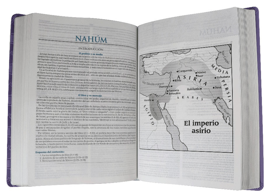 Biblia imitación piel, hoja tamaño 17 x 23 cm. Tipografía clara y legible. Letra texto bíblico tamaño 11 puntos, letra notas tamaño 9 puntos aprox. Canto plateado