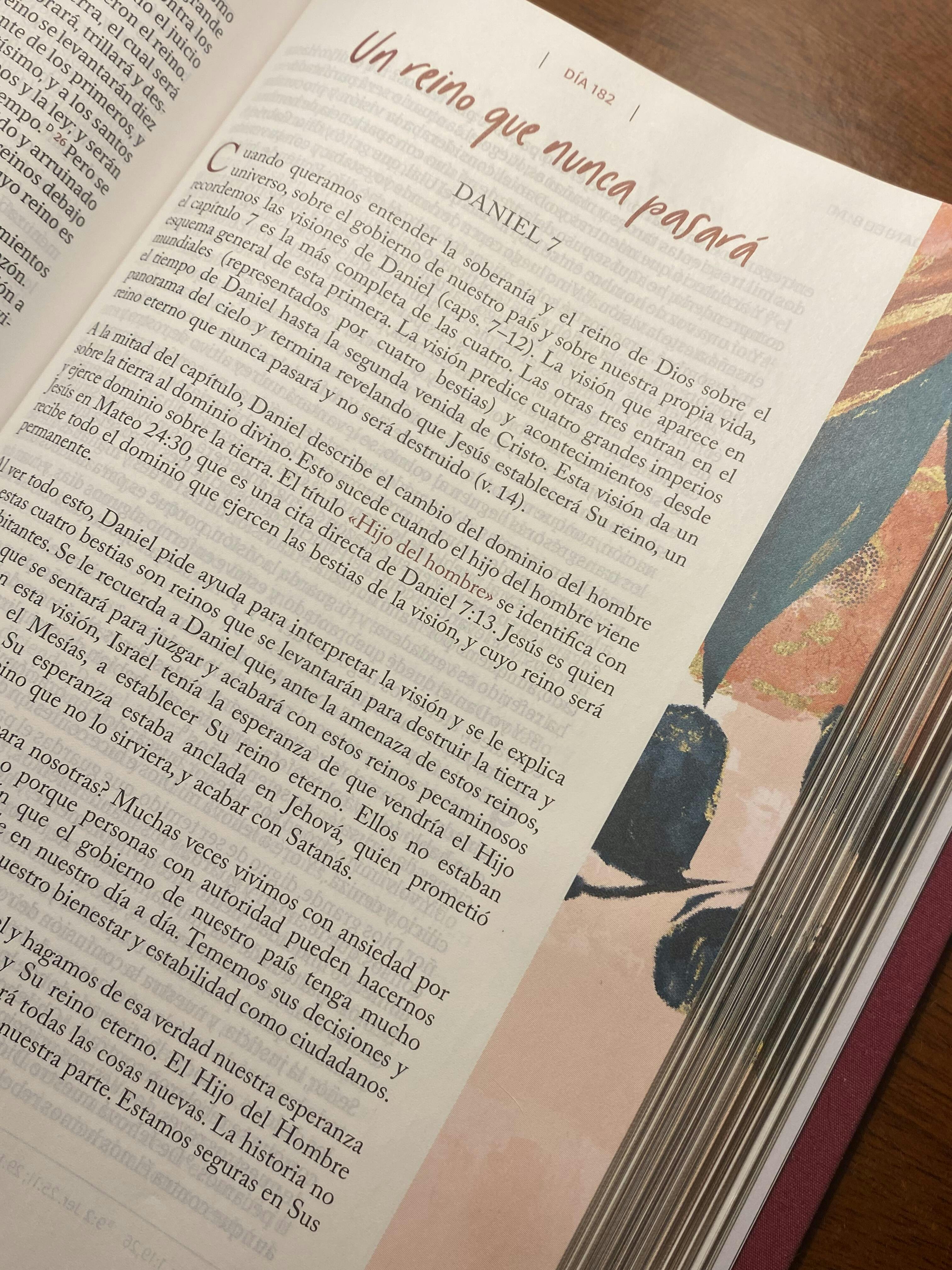Me encantó porque además de ser súper bonita, ayuda un montón a ver a Cristo en cada parte de la Biblia. Los devocionales están buenísimos y los márgenes son ideales para escribir notas y oraciones. Para mis tiempos con Dios ha sido un súper regalo: lindo diseño, buen contenido y siempre centrada en el evangelio.