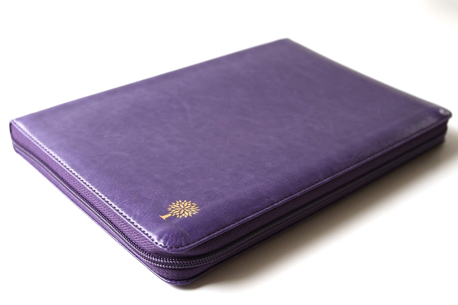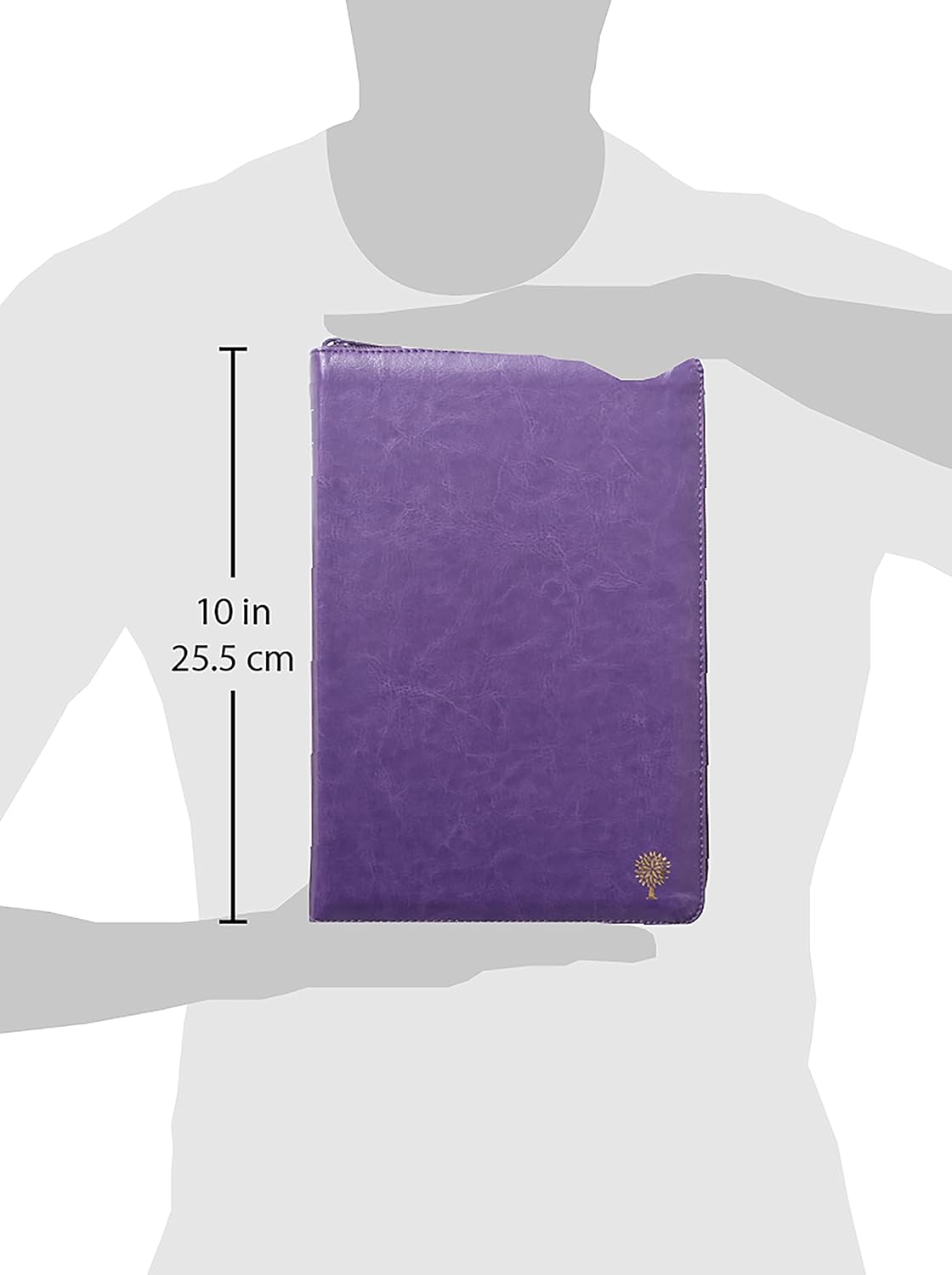 Biblia de tamaño y letra grande. Símil piel morado, con cremallera y estampado dorado en la cubierta. Incluye canto dorado, cinta marcadora y fotos a color de Tierra Santa.