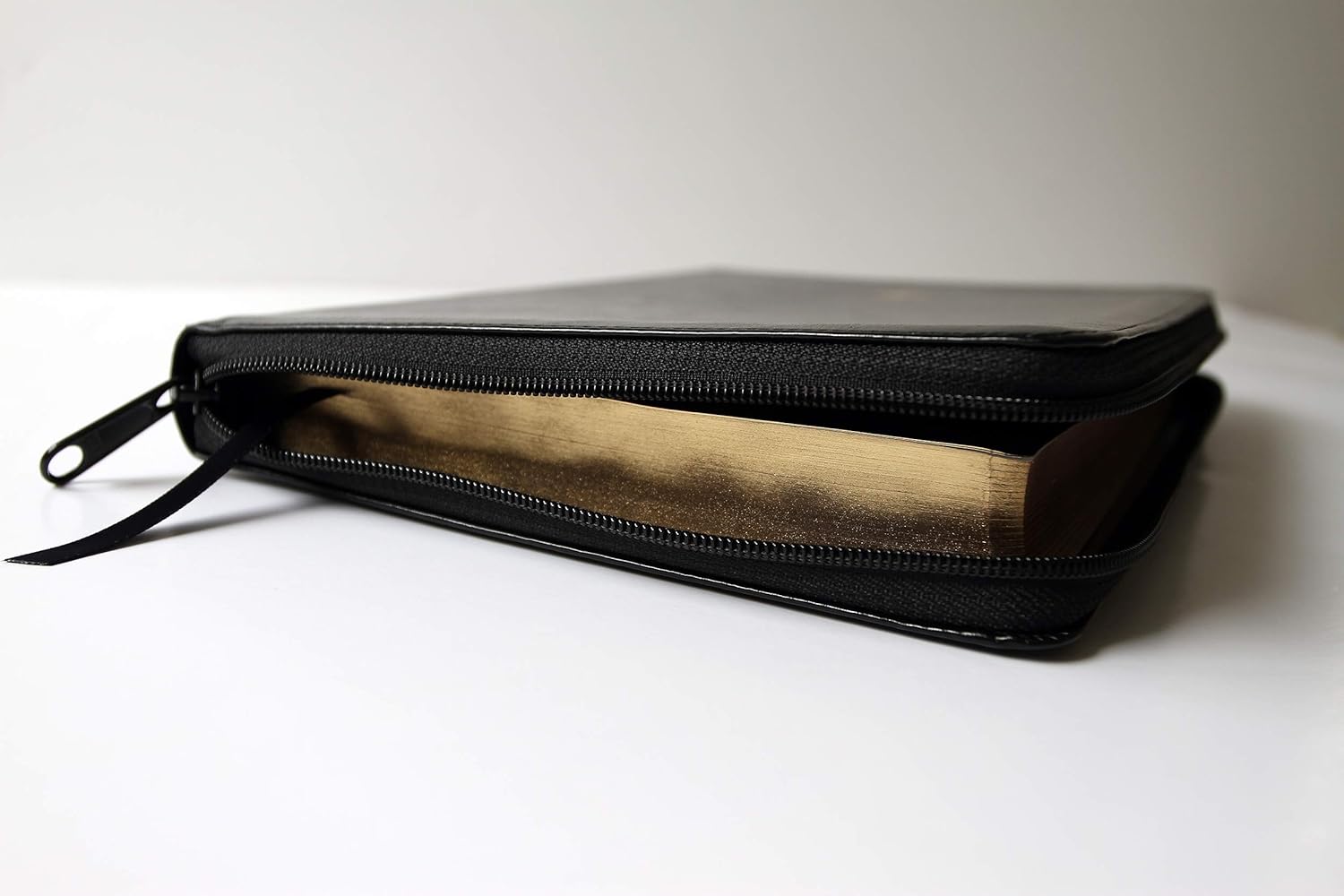 Biblia de tamaño y letra grande, símil piel de color negro, con cremallera. Incluye canto dorado, cinta marcadora y fotos a color de Tierra Santa.