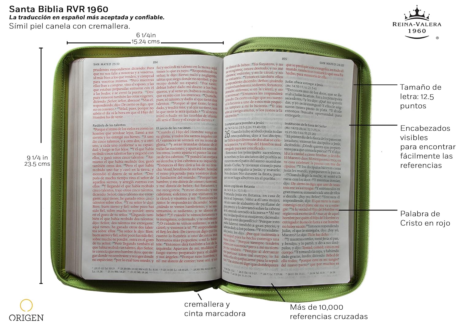 Biblia de tamaño y letra grande, símil piel verde, con cremallera. Incluye canto dorado, cinta marcadora y fotos a color de Tierra Santa.